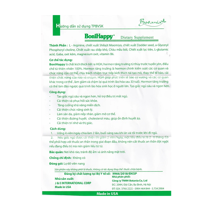 Viên uống BoniHappy Botania là sản phẩm giúp tái tạo và điều hòa giấc ngủ sinh lý tự nhiên, mang đến lại giấc ngủ ngon và sâu cho người mất ngủ mãn tính. Ngoài ra, sản phẩm còn có công dụng cải thiện trí nhớ, đường huyết và giúp ổn định huyết áp.