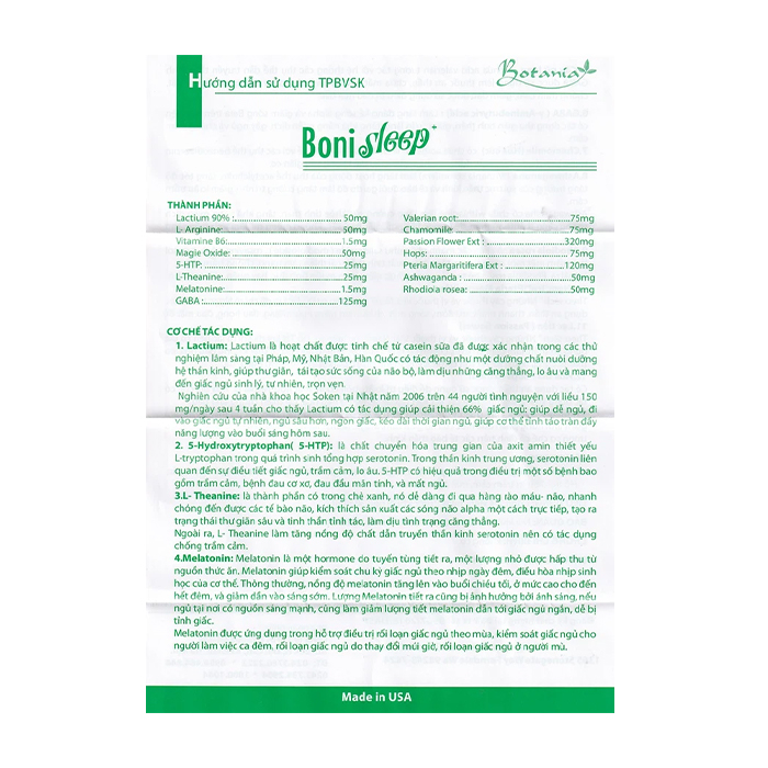 - Bonisleep giúp an thần, giảm căng thẳng thần kinh, giảm stress, giảm lo âu, giúp dễ ngủ, ngủ ngon giấc.
