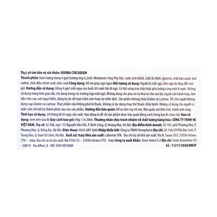 Thực phẩm bảo vệ sức khỏe Buona Circadiem là giải pháp hỗ trợ cải thiện giấc ngủ hiệu quả cũng như vô cùng an toàn để sử dụng cho người lớn và cả con nhỏ ở những giai đoạn đầu đời. Với thành phần chính là melatonin tinh khiết đến 99%, sản phẩm hiện đang được nhiều bậc cha mẹ tin dùng với mong muốn điều chỉnh đồng hồ sinh học tự nhiên của con em mình một cách lành tính và tối ưu. Sản phẩm có xuất xứ từ Ý, được nhập khẩu trực tiếp và tuân thủ các tiêu chuẩn nghiêm ngặt theo quy chuẩn chất lượng châu Âu.