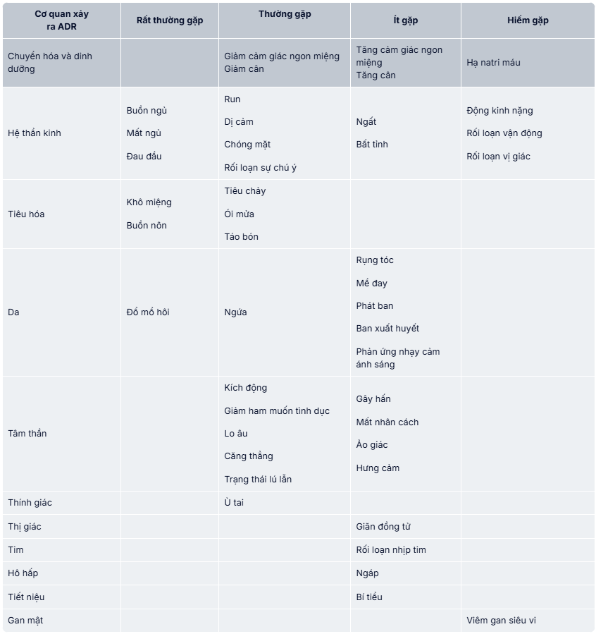 Các phản ứng có hại của thuốc được phân nhóm theo tần suất, quy ước như sau: Rất thường gặp (ADR >= 1/10), thường gặp (1/100 <= ADR < 1/10), ít gặp (1/1000 <= ADR < 1/100), hiếm gặp (1/1000 <= ADR < 1/10000) và rất hiếm gặp (ADR < 1/10000), không biết (không thể ước tính từ dữ liệu sẵn có).