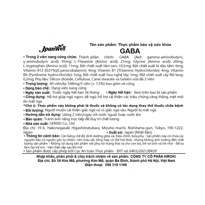 Gaba Jpanwell được nhập khẩu chính thức bởi JpanWell. Với thông điệp 'Made in Japan', JpanWell mong muốn tạo sự uy tín và niềm tin chất lượng trong lòng khách hàng. Cam kết cung ứng cho thị trường Việt Nam dòng sản phẩm được chọn lọc rất kỹ lưỡng và sản xuất tại Nhật Bản. Các sản phẩm của JpanWell đều được Bộ Y tế Việt Nam kiểm định chất lượng, cấp giấy chứng nhận được phép nhập khẩu và phân phối.