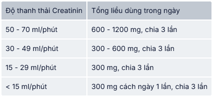 Cần chỉnh liều cho bệnh nhân suy thận tùy theo độ thanh thải creatinin như sau: