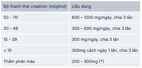 Phải giảm liều, liều thích hợp cần hiệu chỉnh theo độ thanh thải creatinin, được khuyến cáo như sau: