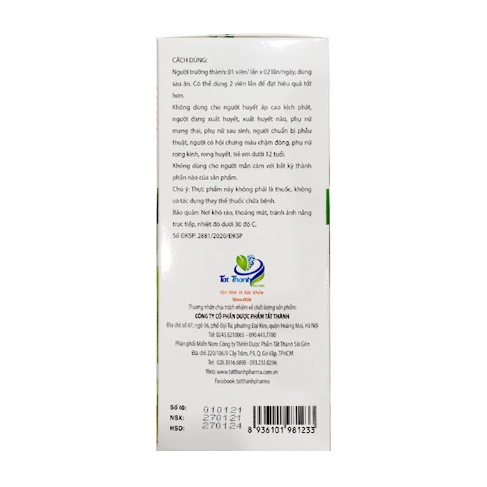Viên uống hoạt huyết ích não Ginkgo Bacopa 2200++ Tat Thanh hỗ trợ hoạt huyết, tăng cường tuần hoàn máu não, giúp cải thiện các triệu chứng do thiếu năng tuần hoàn não. Giảm nguy cơ di chứng sau tai biến mạch máu não do tắc mạch.