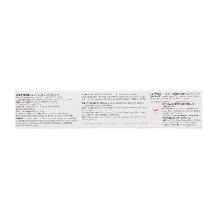 Kinh Vương Não Bộ Hồng Bàng hỗ trợ hoạt huyết, tăng cường tuần hoàn não, giảm các triệu chứng thiểu năng tuần hoàn não. Giúp hỗ trợ các chức năng của não bộ như vận động, nhận thức trí nhớ và ngôn ngữ.