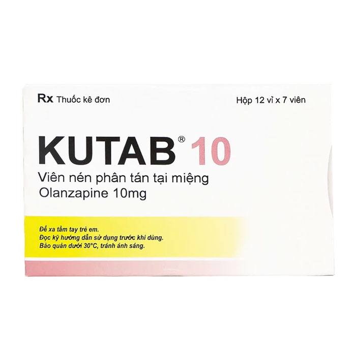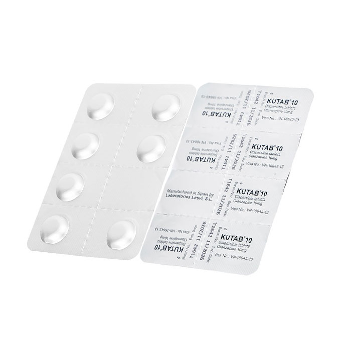 Thuốc Kutab 10 Levis chứa hoạt chất Olanzapine dùng trong điều trị tâm thần phân liệt, điều trị giai đoạn hưng cảm vừa đến nặng và dự phòng tái phát rối loạn lưỡng cực ở những bệnh nhân giai đoạn hưng cảm đã có đáp ứng với lần điều trị đầu tiên.
