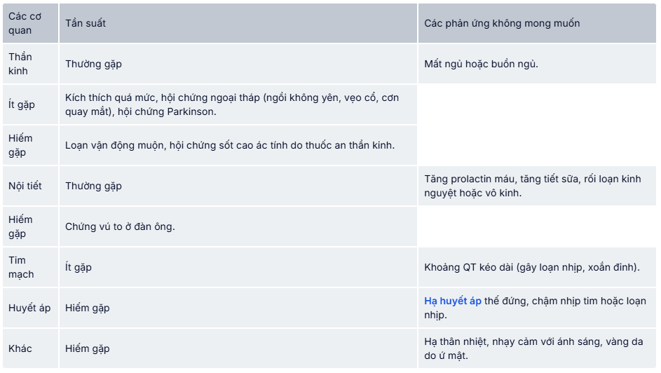 - Các tác dụng không mong muốn thường nhẹ và ít xảy ra. Nếu có hội chứng ngoại tháp có thể giảm liều hoặc dùng thuốc chống Parkinson kháng cholinergic. Nếu có biểu hiện của hội chứng sốt cao ác tính, phải ngừng ngay thuốc. Đề phòng bị xoắn đỉnh cẩn tránh phối hợp với các thuốc làm giảm kali, hoặc kéo dài khoảng QT.