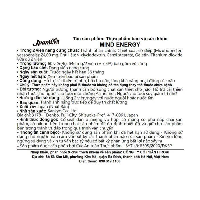 Mind Energy Jpanwell hỗ trợ cải thiện trí nhớ, bổ não 60 viên
