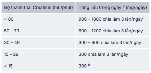 - a Liều hàng ngày nên dùng 3 lần/ngày. Liều dùng điều trị cho bệnh nhân có chức năng thận bình thường (độ thanh thải creatinin > 80 ml/phút) trong khoảng 900 – 1800 mg/ngày. Phải giảm liều cho những bệnh nhân suy chức năng thận (độ thanh thải creatinin < 79 ml/phút).