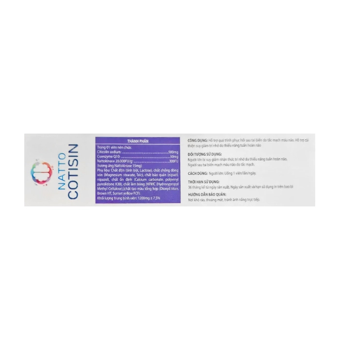 Viên uống Natto Cotisin 30 viên. Hỗ trợ quá trình phục hồi sau tai biến do tắc mạch máu não. Hỗ trợ cải thiện suy giảm trí nhớ do thiếu năng tuần hoàn não.