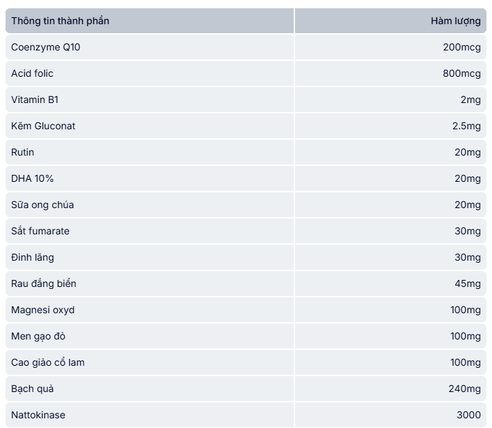 - Nattokinase: Hỗ trợ hoạt huyết, tăng cường tuần hoàn não, giúp bền thành mạch, hỗ trợ làm tan cục máu đông, giúp giảm nguy cơ hình thành cục máu đông, hỗ trợ quá trình phục hồi sau tai biến mạch máu não do tắc mạch.