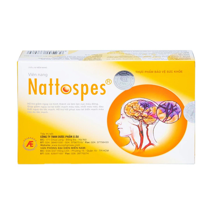 Viên uống Nattospes với thành phần chủ yếu là Nattokinase, là một loại enzyme được chiết xuất từ đậu nành lên men hay còn gọi là Natto - món ăn truyền thống của rất nhiều người Nhật. Sản phẩm này có tác dụng tiêu cục máu đông, hạn chế nguy cơ đột quỵ, tai biến và tăng cường sức khỏe tuần hoàn của cơ thể, giúp bạn an tâm tận hưởng cuộc sống khỏe mạnh.