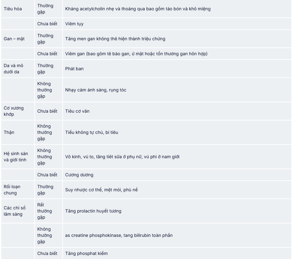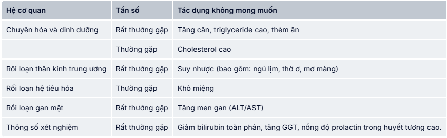- Triệu chứng cấp tính như đổ mồ hôi, mắt ngủ, run, lo lắng, buồn nôn, hoặc nôn mửa xuất hiện với tỷ lệ hiếm (<0,01%) khi dừng điều tri olanzapine một cách đột ngột.