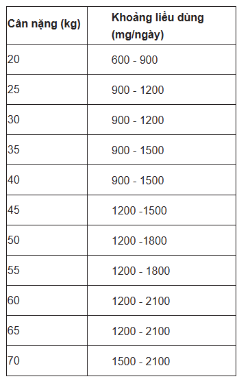 Cân nặng > 39 kg: 1800 mg/ngày chia 2 lần