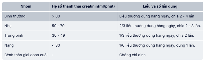 Liều thuốc hàng ngày được tính cho từng bệnh nhân theo chức năng thận. Tham khảo bảng dưới đây và chỉnh liều theo chỉ dẫn. Để dùng bảng phân liều này, cần ước lượng hệ số thanh thải creatinin (ml/phút) từ nồng độ creatinin huyết thanh (mg/dl) qua công thức sau: Clcr= {[140 – tuổi (năm)]} x thể trọng (kg)/[72 x creatinin huyết thanh (mg/dl)]} x 0,85 (ở phụ nữ).