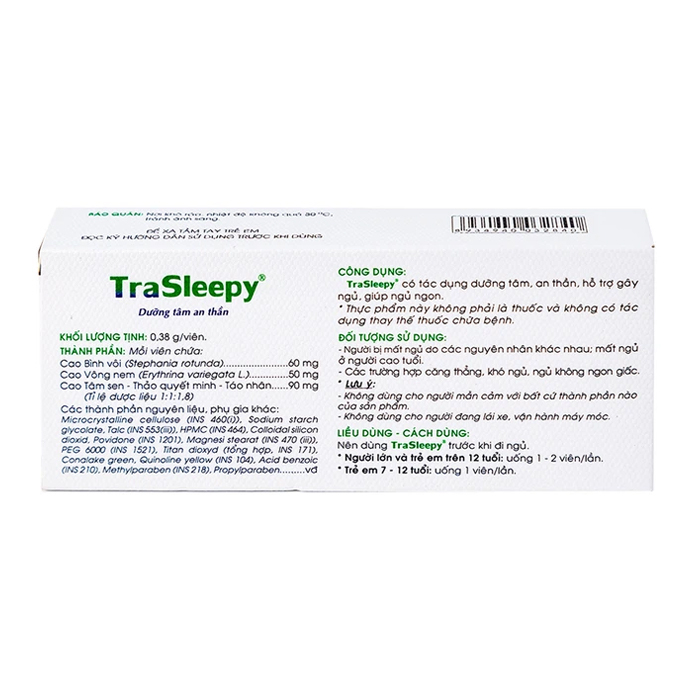 Viên uống TraSleepy Traphaco với chiết xuất từ các thành phần thảo dược thiên nhiên vô cùng lành tính, mang đến nhiều công dụng tốt cho sức khỏe và tinh thần, giúp dưỡng tâm, an thần, giảm stress cho người sử dụng.