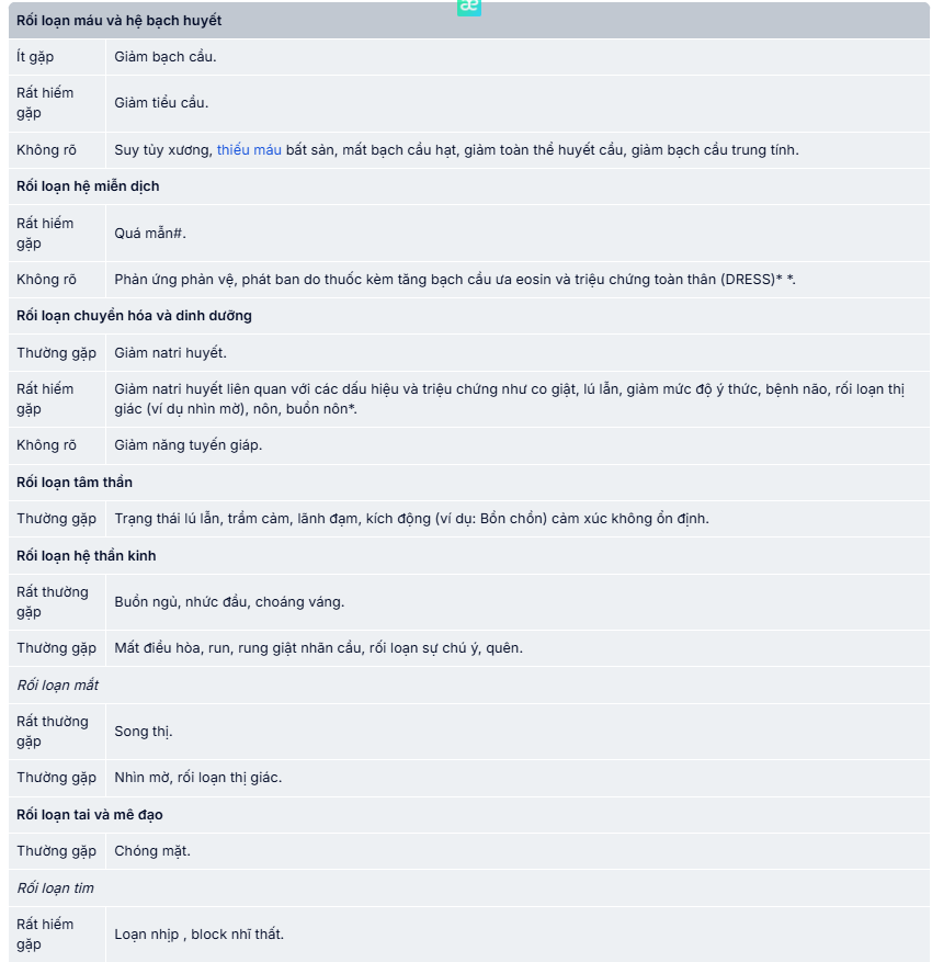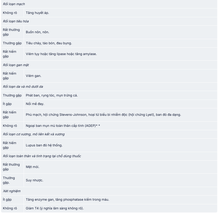 Trong mỗi nhóm tần suất, các tác dụng không mong muốn được trình bày theo thứ tự mức độ nghiêm trọng giảm dần.