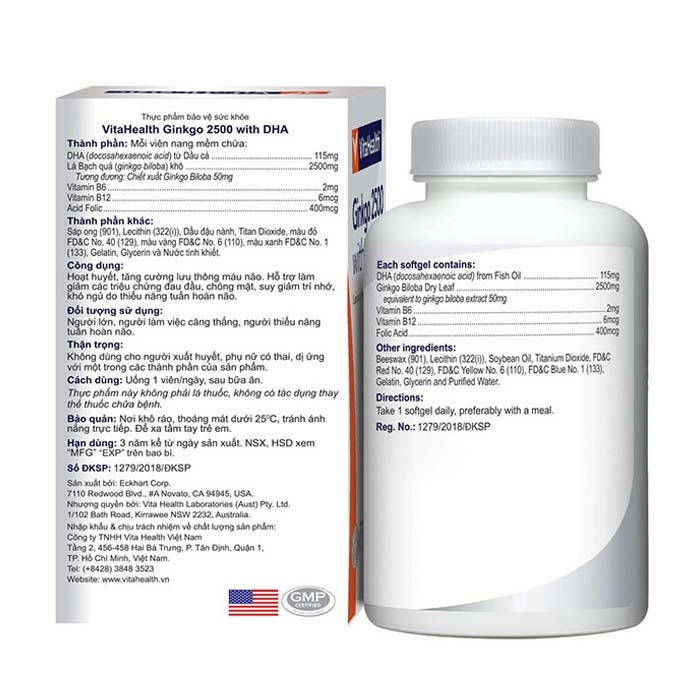 Thực phẩm bảo vệ sức khỏe VitaHealth Ginkgo 2500 with DHA: Hỗ trợ hoạt huyết, tăng cường lưu thông máu não. Hỗ trợ làm giảm các triệu chứng đau đầu, chóng mặt, suy giảm trí nhớ, khó ngủ do thiểu năng tuần hoàn não.