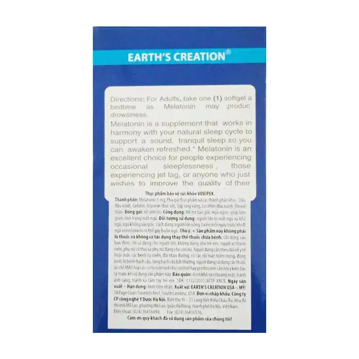 Viên uống Vovipex Natural Earth’s Creation 60 viên hỗ trợ điều hòa giấc ngủ, giúp ngủ ngon, hỗ trợ điều trị mất ngủ, hỗ trợ tạo giấc ngủ ngon cho những người muốn có giấc ngủ vào thời gian không phù hợp với nhịp sinh học như công nhân làm ca, sau chuyến bay dài có thay đổi múi giờ.